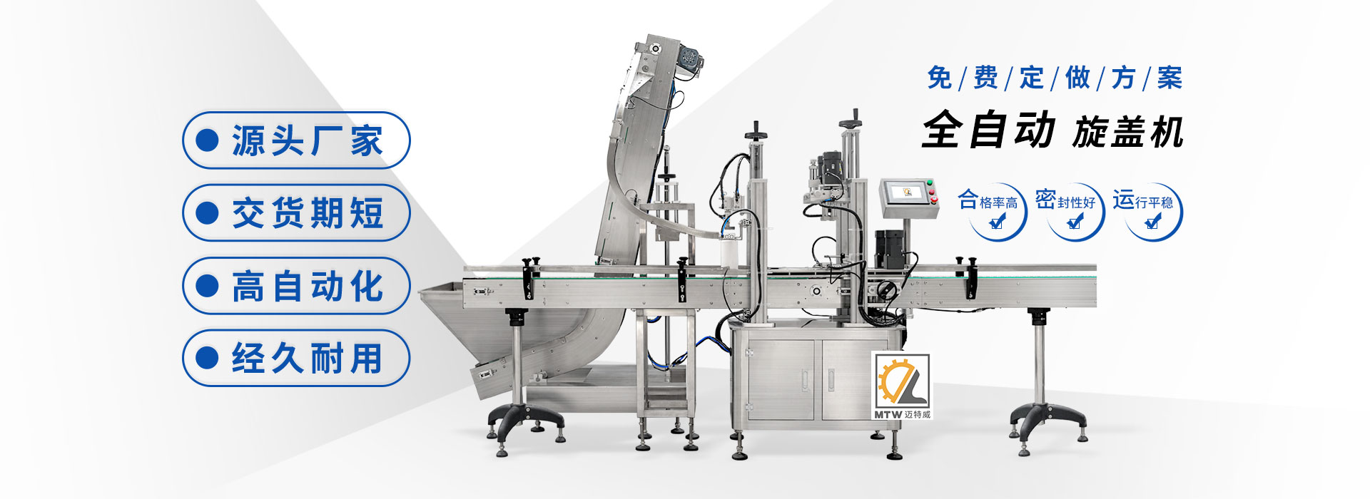 邁特威自動(dòng)化設(shè)備(天津)有限公司坐落于素有京津明珠之稱的天津·武清區(qū),是國家高新技術(shù)企業(yè),專注生產(chǎn)、研發(fā)、銷售全自動(dòng)灌裝機(jī)、旋蓋機(jī)、封口機(jī)、貼標(biāo)機(jī)等系列產(chǎn)品,立足京津冀、服務(wù)全國,遠(yuǎn)銷海內(nèi)外,團(tuán)隊(duì)由行業(yè)高技術(shù)人士組成,為國內(nèi)外食品、日化、糧油、醫(yī)藥等企業(yè)提供滿意的包裝解決方案。 查看詳情